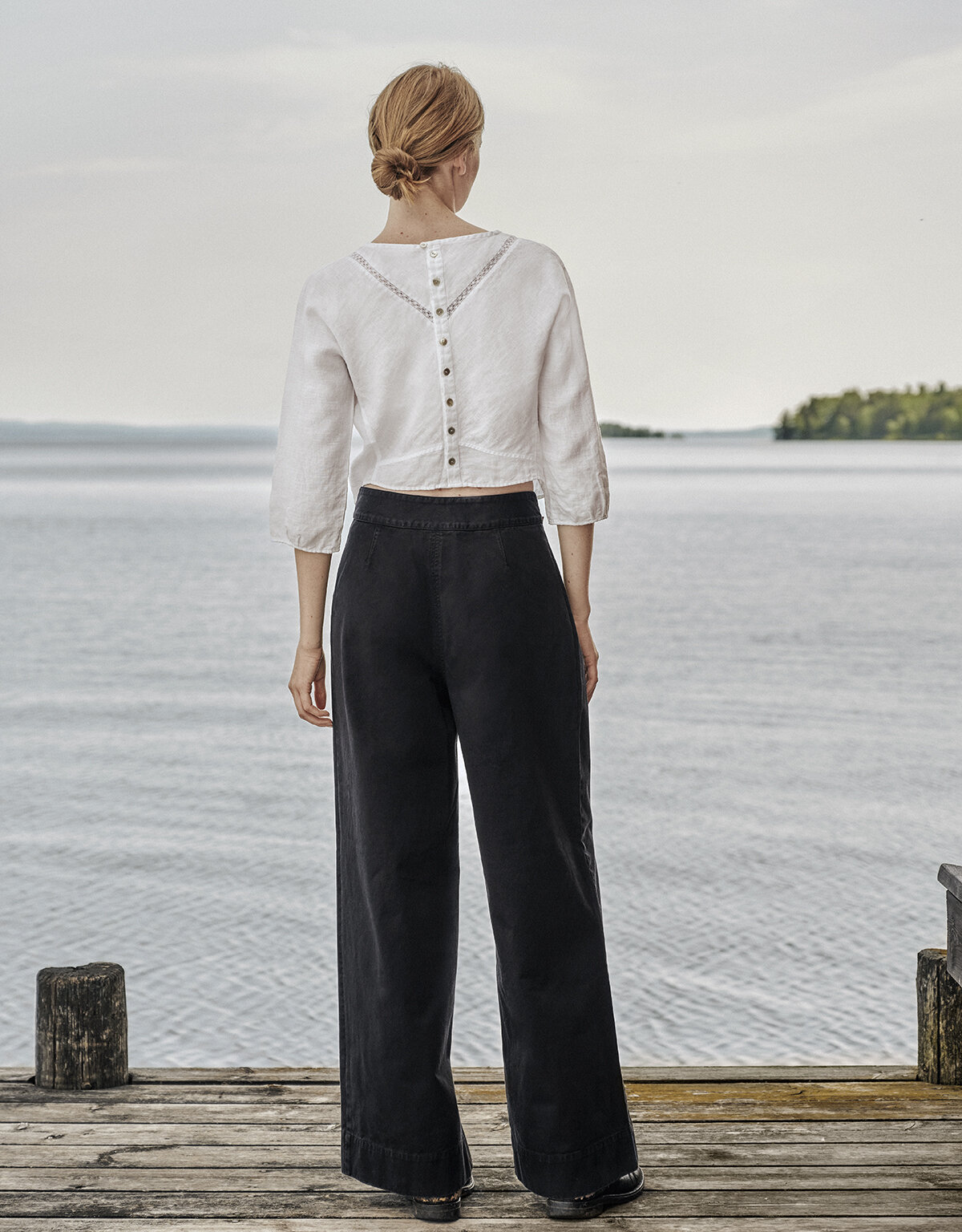 Soft, lightweight 100% linen. The styles made in this material have an airy, fluid drape. Our garments are pre-washed and tumble dried for a relaxed leisure look. No need to iron the garments. Always wash inside out and with washing detergent without bleach. The raw material for this linen is grown in France, Belgium, and Holland and is woven and dyed in Lithuania according to high sustainability standards.