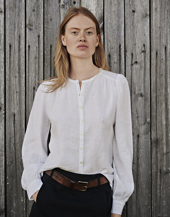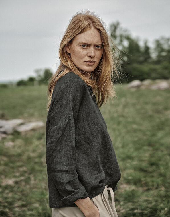 Soft mélange coloured linen. The mélange linen is specially dyed with a method called delavé and will gradually fade in colour wash by wash to a beautiful vintage look. Our garments are washed and tumble dried for a relaxed and soft look. No need to iron the garments. The raw material for the mélange linen is grown and spun in France. It is woven in Italy.