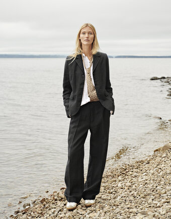 100% linen. Soft, dense linen in solid taupe. Our garments are washed and preshrunk. The raw material, the flax, for this linen is grown in France, Belgium, and Holland and is woven and dyed in Lithuania according to high sustainability standards. As always with linen, slobs and irregularities are a part of the character of the material. If you have a slob in an unsuitable place, remove it carefully by hand. Lining from acetate.
