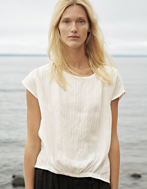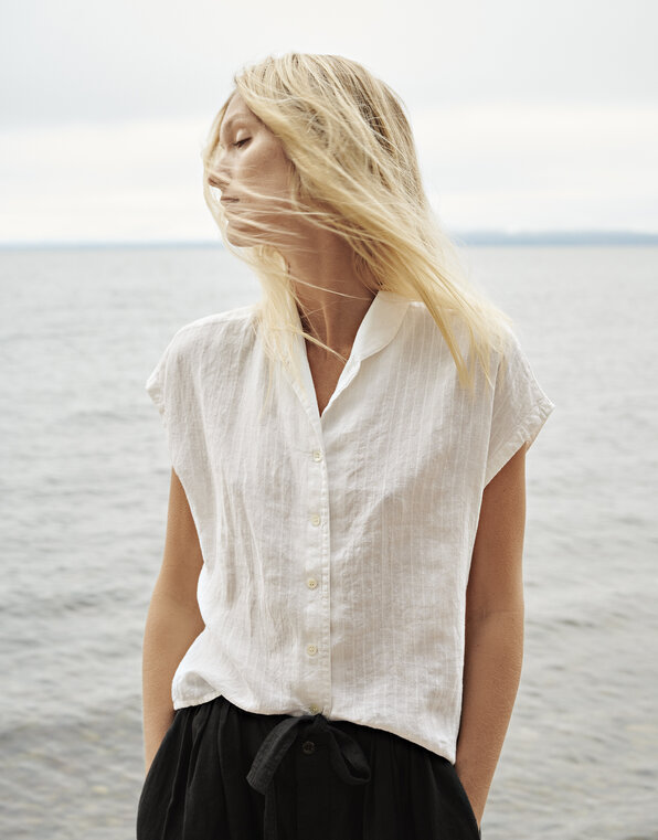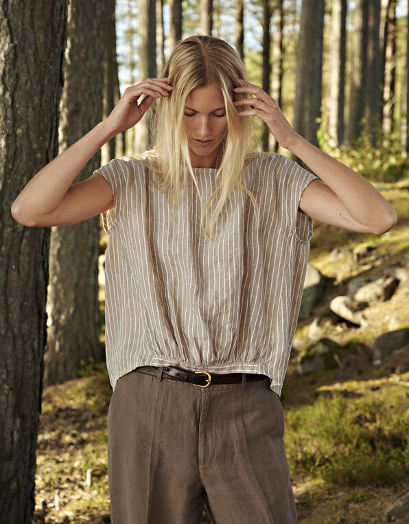 Lightweight, striped 100% linen. Elegant striped linen in two colour ways: white stripe and nature stripe. The stripes are woven in a subtle twill construction and are slightly heavier than the ground fabric. In the white stripe version, the pattern is distinguished not by colour, but by structure and the interaction of matte and light-reflecting surfaces. The styles made in this material have an airy, fluid drape. Our garments are pre-washed and tumble dried for a relaxed leisure look. The raw material, the flax, for this linen is grown in France, Belgium, and the Netherlands and is woven and dyed in Lithuania according to high sustainability standards.