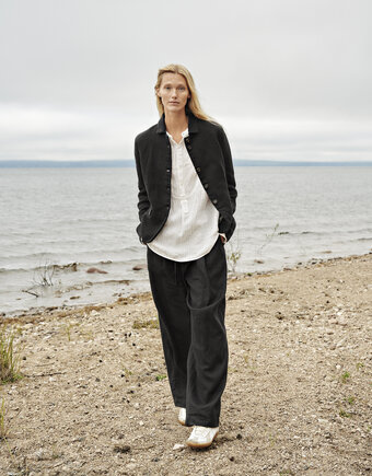 100% linen. Garment dyed heavy linen with a rough handwoven look. Slobs and irregularities are a part of the character of this material. Note that the colour of the lining varies from garment to garment. The colour variations are a part of the beauty and unique look of these garments. All garments are pre-washed and pre-shrunk. The raw material, the flax, is grown in France, Belgium and Holland and is woven and dyed in Lithuania according to high sustainable standards.