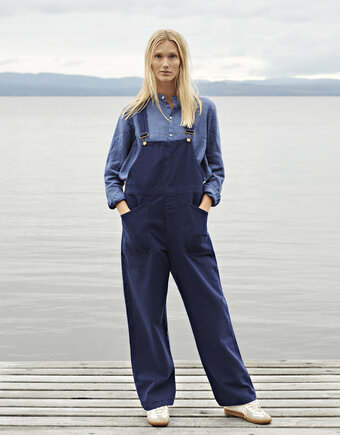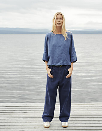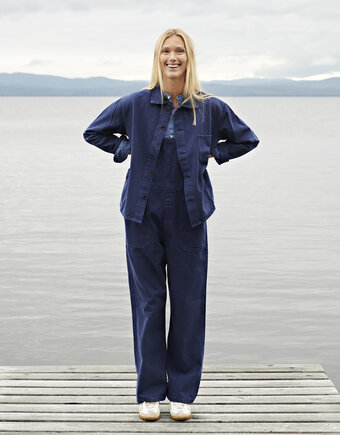 Soft workwear cotton twill in a sustainable combination of cotton, recycled cotton and organic cotton. The garments are dyed into a perfect blue colour inspired by authentic vintage workwear. Note that the colour may vary in tone. The material gets softer by use and wash. Our garments are washed and tumble dried for a relaxed leisure look. No need to iron the garments.
